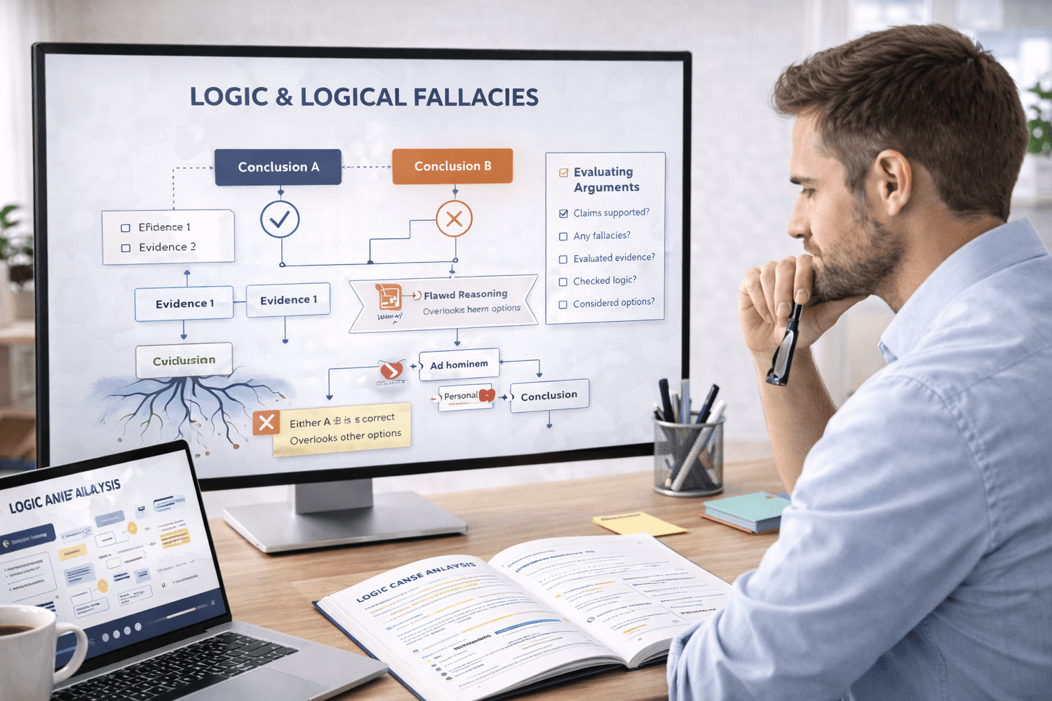 This module covers the Socratic method, deductive vs. inductive reasoning, and a full catalog of logical fallacies you encounter every day in meetings, in news, in sales pitches, in your own head. Once you can spot these, you'll never look at an argument the same way.